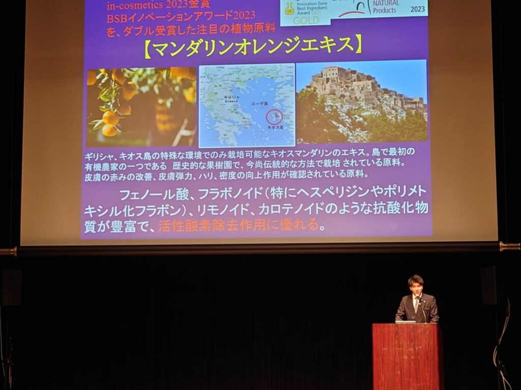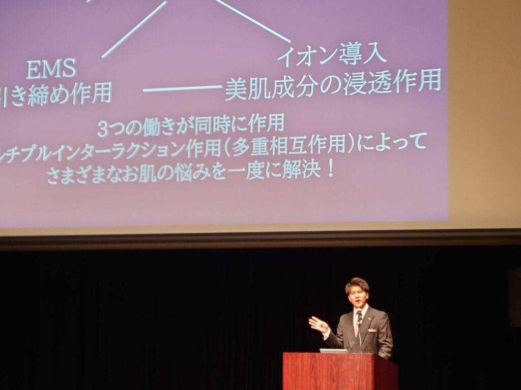 当日は、弊社 営業部の吉川慎也がステージ登壇し、次世代美顔器「セラムヴィーナスカレント」についてプレゼンテーションを行いました。美容機器とスキンケアの融合を目指した本製品は、「微弱電流(マイクロカレント)」による細胞活性化に加え、ドクターセラム独自の美容成分との相乗効果により、これまでにない肌のハリ・弾力・透明感を実現します。