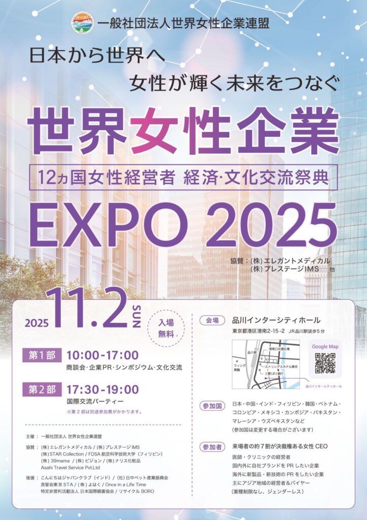 2025年11月2日(日)、東京・品川インターシティホールで開催された世界女性企業EXPO2025に、ドクターセラム株式会社が出展企業として参加いたしました。世界12カ国から女性起業家が一堂に会する国際的な場において、私たちは日本の美容医療発の革新的スキンケア技術を広くご紹介いたしました。