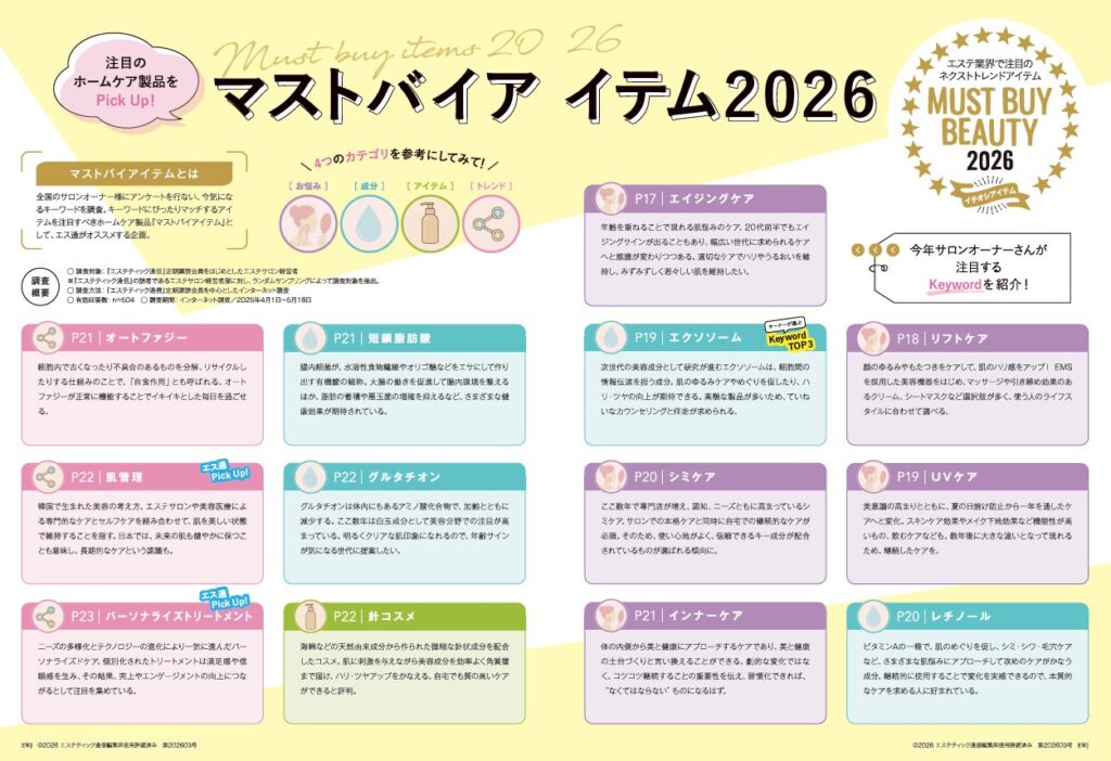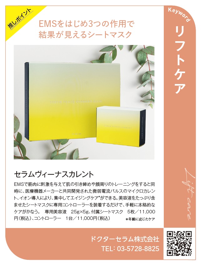 本企画では、注目のホームケア製品がカテゴリ別に紹介されており、セラムヴィーナスカレントは Keyword「リフトケア」 として掲載。