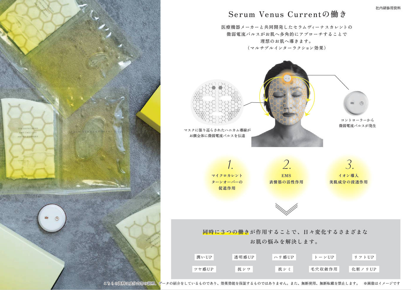 シルクフィブロインは体内の余分なコレステロール、脂肪を吸着し乳化した状態で体外に排出します。ヴィーナスカレントは美容マスクに微弱電流を流し、イオン導入やマイクロカレント機能を加えた製品です。 保湿、しわ改善、リフトアップ、引き締め、ターンオーバー促進などが期待できます。