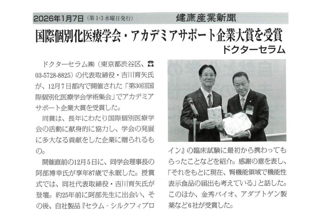 国際個別化医療学会 アカデミアサポート企業大賞 受賞について掲載されました。
